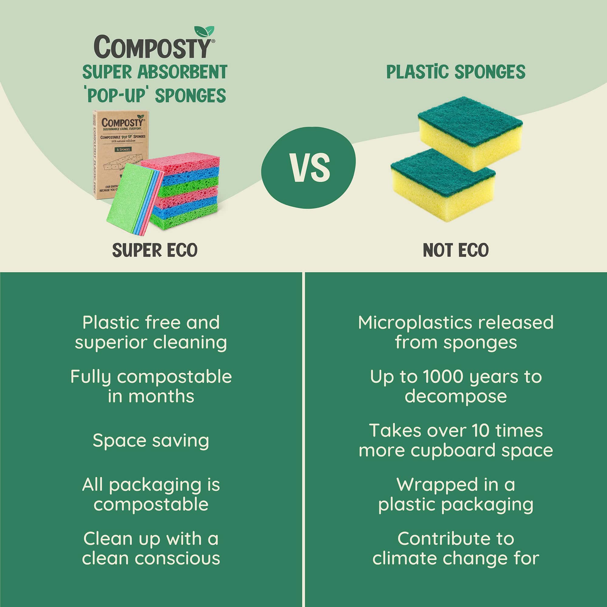Transform your cleaning game with Composty’s Magic ‘Pop-Up’ Eco Sponges! Our unique sponges start thin, but with a splash of water, transform into tough, non-scratch sponges, ready to tackle any cleaning challenge.